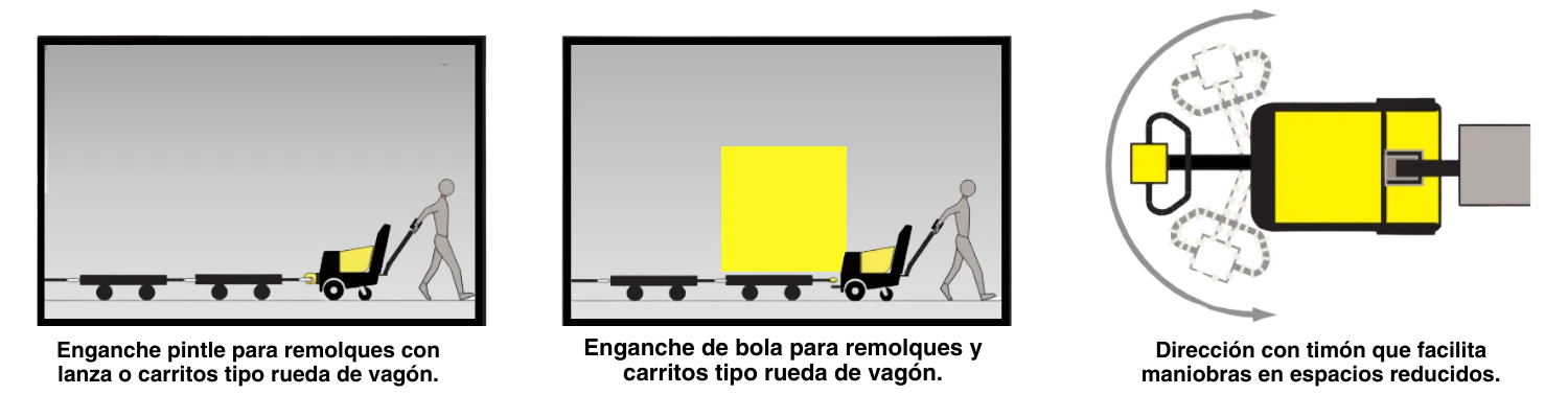 Con una capacidad de arrastre de hasta 6,800 kg (15,000 lb), este equipo se acopla fácilmente mediante enganche tipo pin, pintle o bola, permitiendo mover trenes de carros, remolques industriales o plataformas de carga con eficiencia.